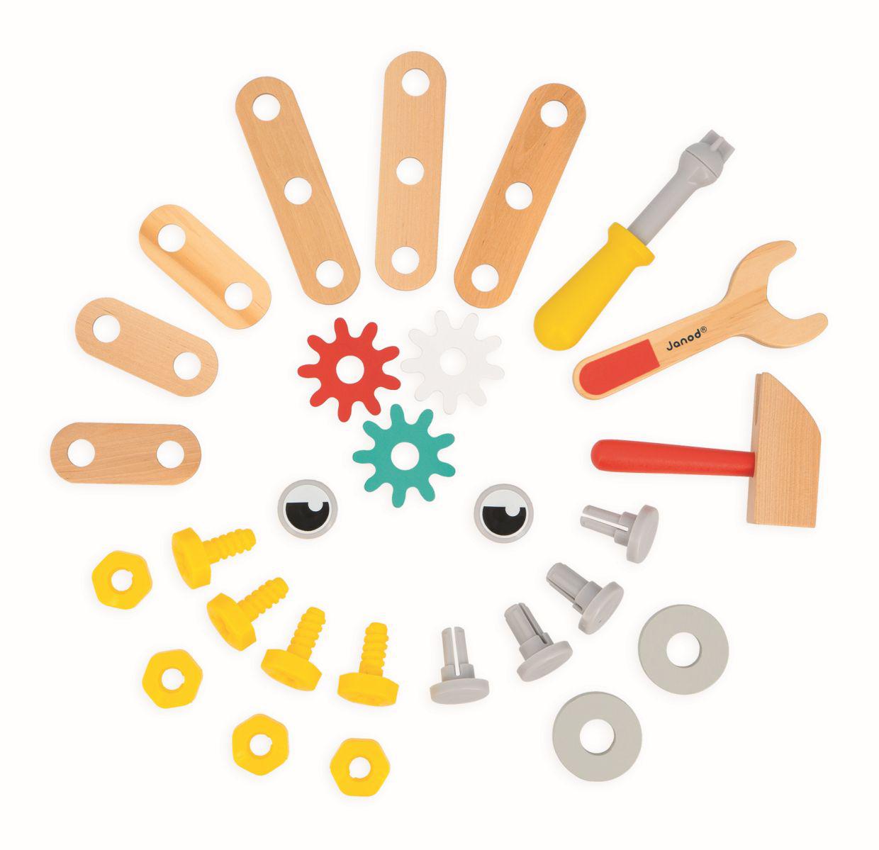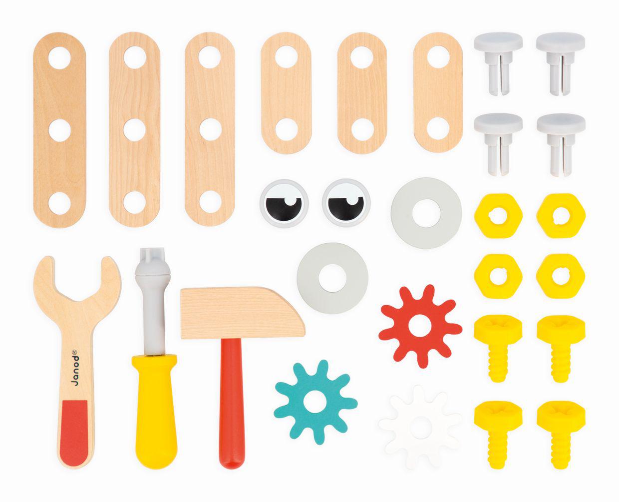 Esta bonita caja de herramientas está compuesta por 3 herramientas, 13 accesorios de madera: tablas y engranajes para crear tus propias construcciones. 14 accesorios de plástico: para enroscar, desenroscar y clavar.
