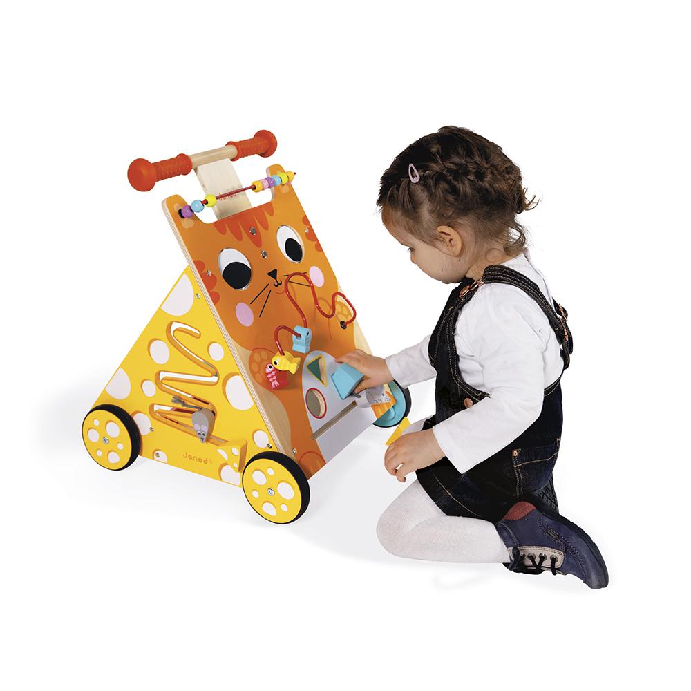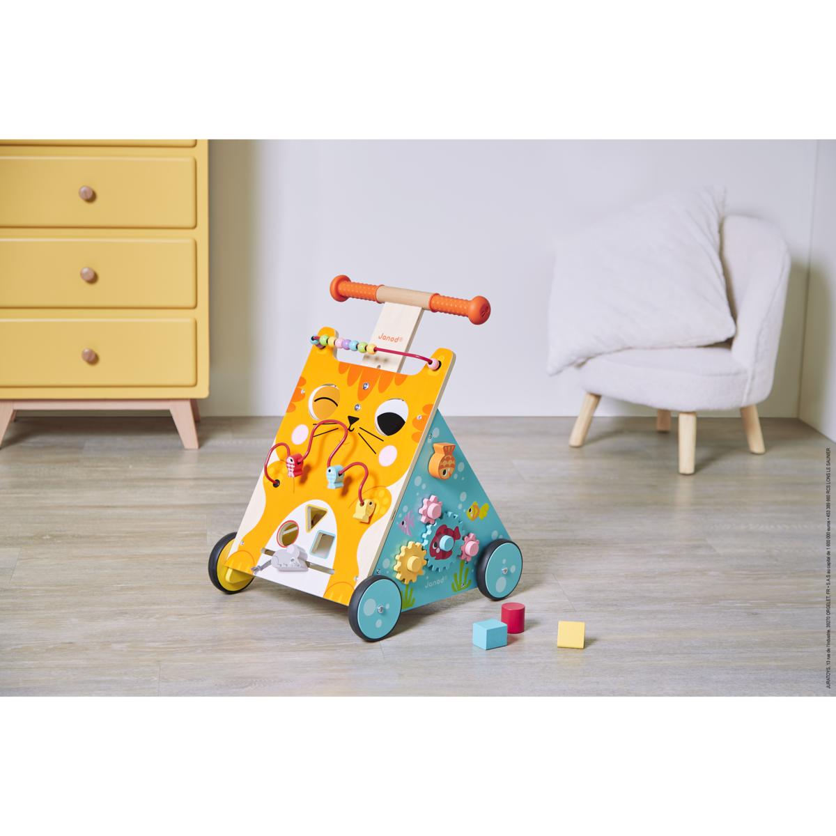 ¡Este carrito multiactividades de madera acompañará a los niños a partir de 1 año con todos los juegos que lleva en sus tres caras! Se divertirán mientras desarrollan la motricidad fina y la destreza con las ocho actividades lúdicas de este ingenioso gatito: looping con peces, caja de formas clásica y ratoncito para deslizar en la parte delantera, circuito con ratón en un lateral, engranajes y botón con sonido del fondo marino en el otro. Los grandes ojos de nuestro gato se giran y sus mejillas son de fieltro para desarrollar el sentido del tacto del niño. Este precioso carrito multiactividades para empujar es ideal para aprender a caminar.