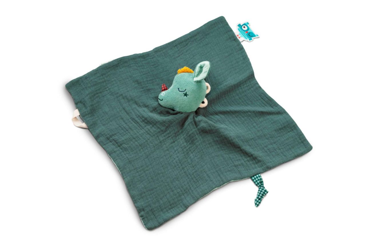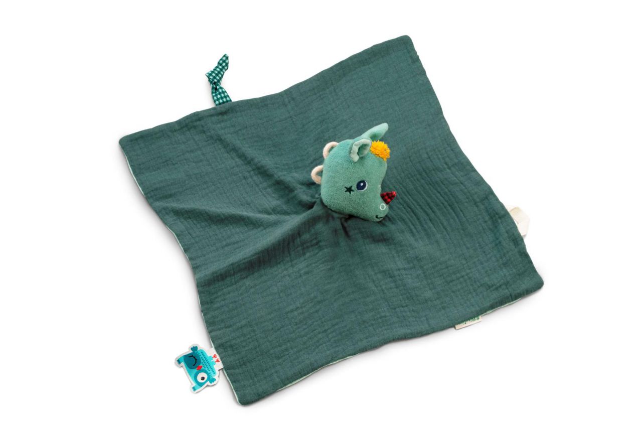 Esta mantita de apego verde de punto orgánico es el aliado que necesita el peque para que le reconforte y esté a su lado durante años. La cabeza es una marioneta de mano y lleva una tela para sujetar el chupete anudándola. Tiene también un asa y una etiqueta para escribir el nombre del bebé.