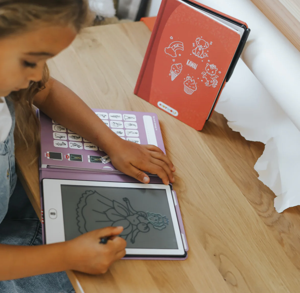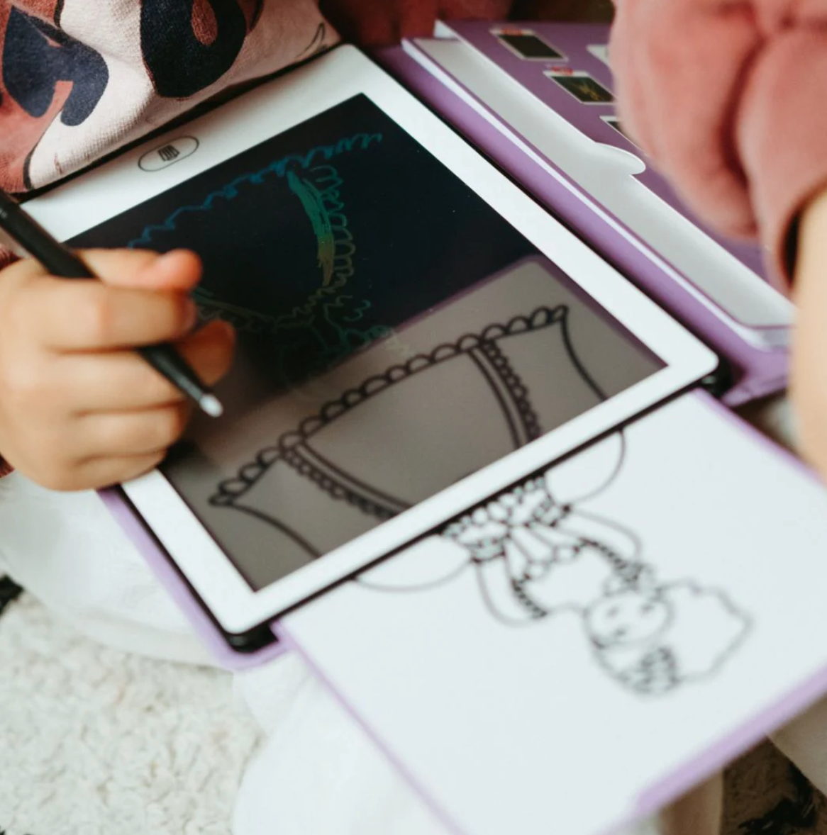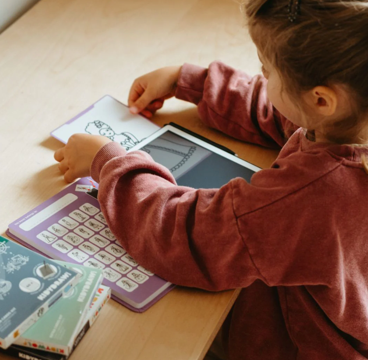 Dale a tu hijo una experiencia de dibujo sin límites con KIDYDRAW-MINI, un cuaderno de dibujo con pantalla LCD que incluye 30 ilustraciones para calcar y 5 temas únicos.