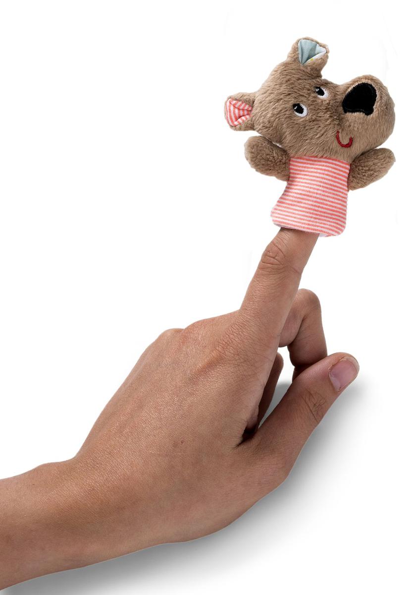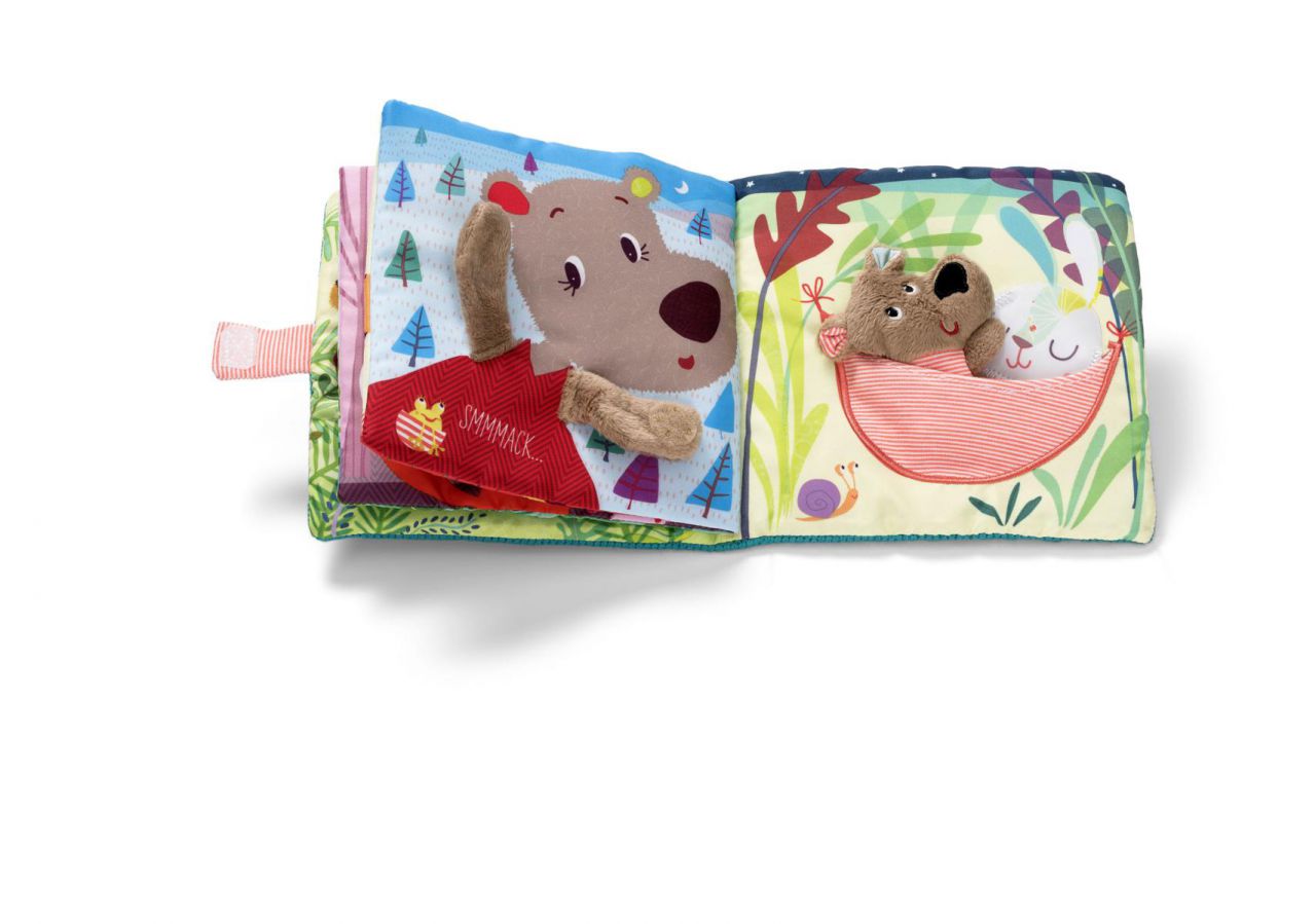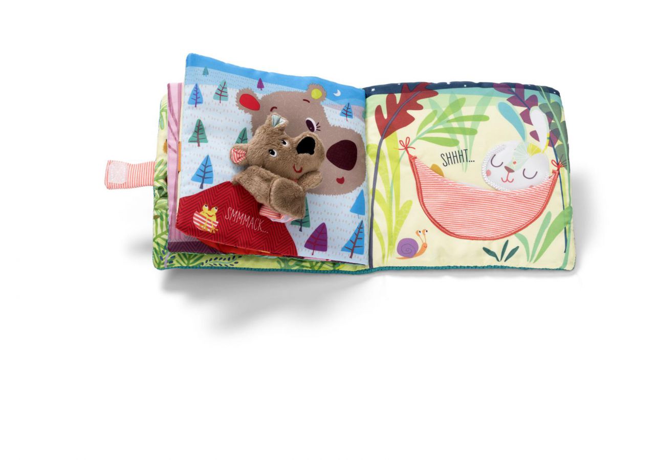 César es un oso muy mimoso y siempre da las buenas noches a todos sus amigos antes de acostarse él también, no sin antes abrazar por último a su mamá. Solo hay que ponerse la marioneta de dedo del oso César y contarle el cuento que quieras al niño con este libro de tela.