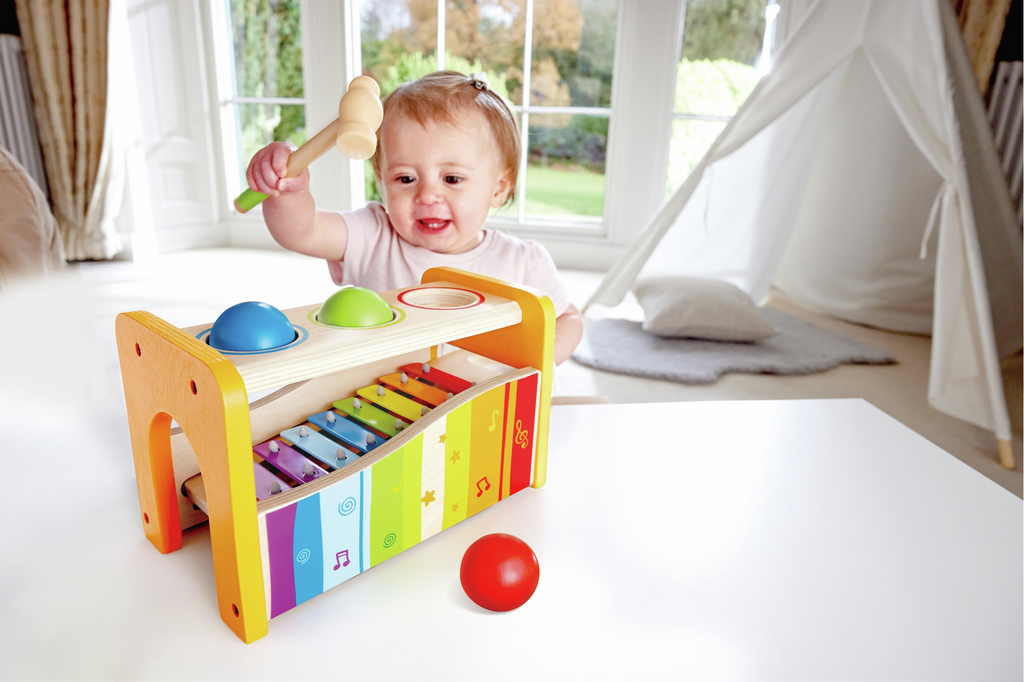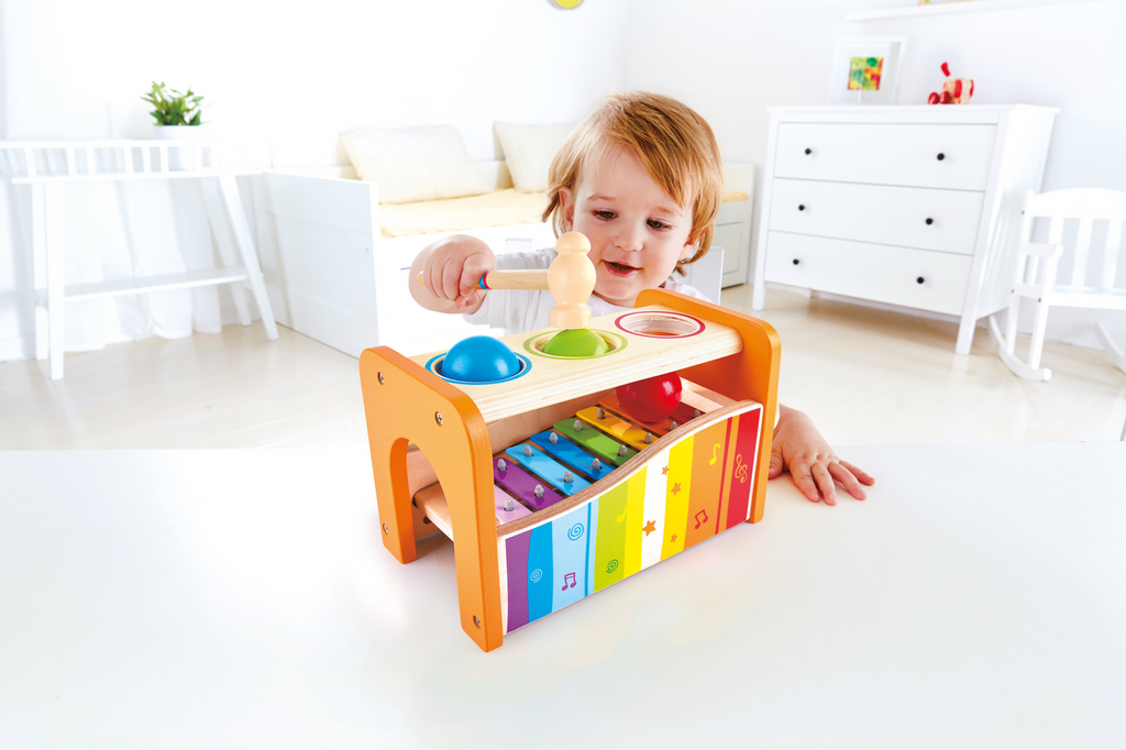 El juego de coordinación consiste en tres bolas de diferentes colores, que se asocian con los colores que circulan los agujeros donde las tienen que posicionar antes de martillear, lo que fomenta el desarrollo de la motricidad fina y coordinación ojo-mano. Al golpear sobre las bolas, éstas caen sobre las teclas del xilófono produciendo agradables sonidos.