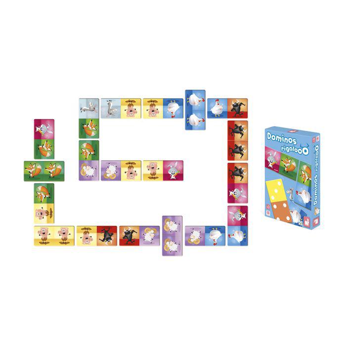 Contiene 28 piezas de domino de cartón. 2 posibilidades de juego: un lado ilustrado, para localizar y montar las 2 animales idénticos, un lado numerado