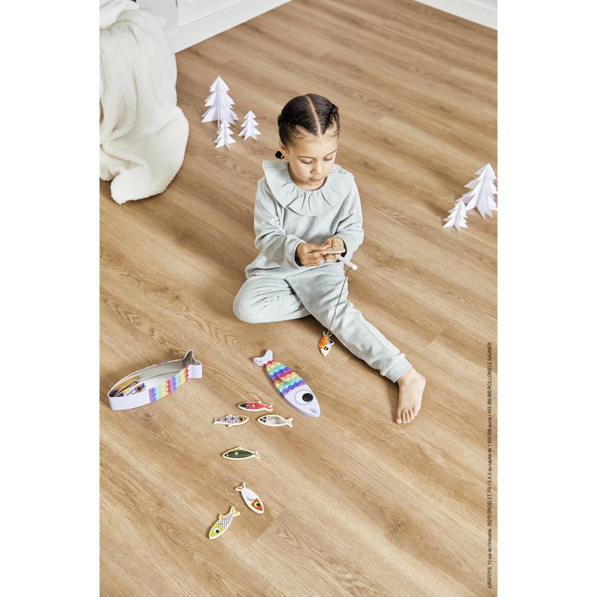 Peces de madera impresos mediante transferencia de calor por una cara y un clavo remachado por cada lado, lo que hace que el juego sea realmente seguro para los niños menores de 3 años, ya que los remaches no pueden soltarse.